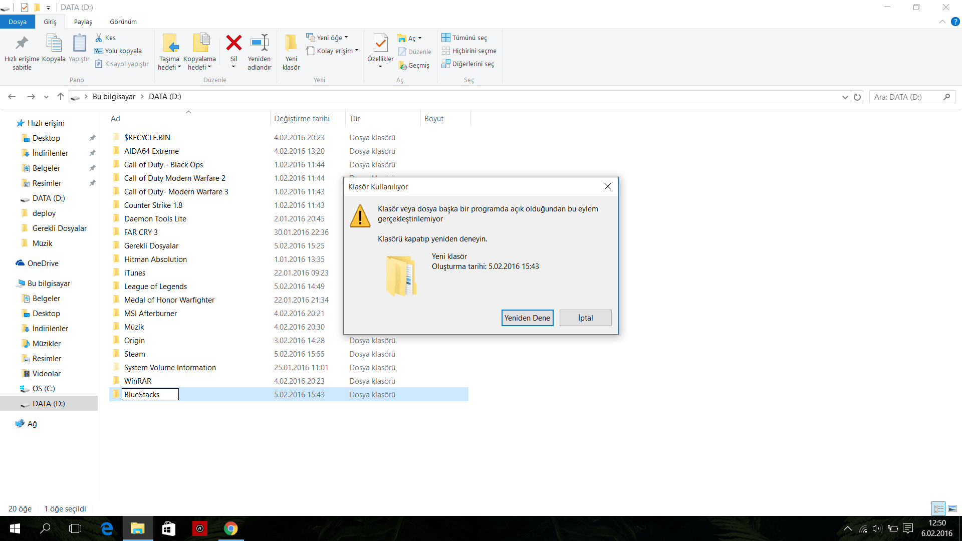 Bluestacks indirmiştim ondan sonra oldu şu an silemiyorum Bluestacks'ı. Adını da değiştiremiyorum. Bluestacks dosyasına hiçbir işlem yapamıyorum. Ayrıca C ve D sürücülerinde diğerlerinden farklı silik dosyalar var fotoğraflarını atıyorum hepsinin lütfen yardım edin.