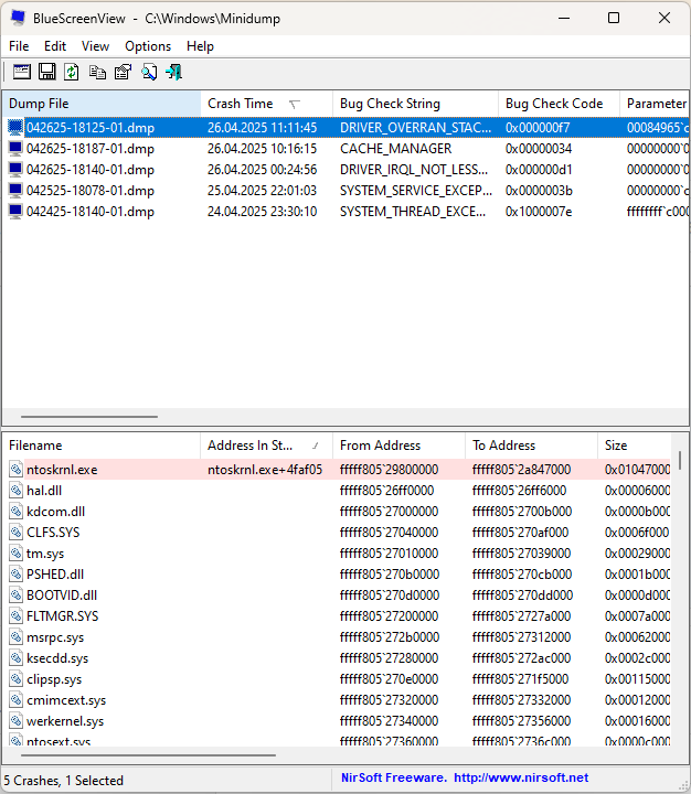 ntoskrnl.exe ntoskrnl.exe+4faf05 fffff805'29800000 fffff805'2A847000 0x01047000 0x1b10d63a microsoft® windows® operating System NT kernel & System 10.0.22621.5124 (winbuild.160101.0800) Microsoft Corporation C:\Windows\system32\ntoskrnl.exe
