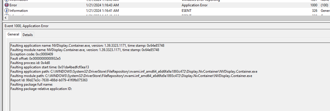 Merhaba, ben FX504GD BIOS modelini kullanıyorum. Son zamanlardaki oyun performansları bayağı düştü. Dengesiz performanslar sergiliyordu, ben de System log ile ilişkin bir sorun olduğunu düşündüm ve Microsoft Support'tan servis aldım. Temsilcim, Aygıt Yöneticisi ile kartın sürücüsünü güncelledi; daha sonra Event Viewer'dan sistem dosyalarına bir göz attı. NVDisplay.Cantainer.exe adlı uygulamanın hata verdiğini gördü. Düşük hafıza kullanımının oyunlarda dengesiz performanslar vermesinin bu log arızasından kaynaklandığını söyledi. Birkaç işlem yaptık, Windows 10 ISO indirdik, kurduk, yükselttik fakat hiçbir işe yaramadı. Tekrar kontrol ettiğimde sorunun çözülmediği açık. Aşağıdaki ekte görebilirsiniz hatayı.