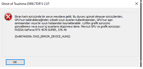 Ghost of Tsushima oynarken ilk baştaki hata gibi bir hata aldım. DDU ile ekran kartını en baştan kurdum ama aynı hatayı yine aldım düşük ayarlara çeksem de alıyorum ki daha önce oynadığım şekilde 40 saatim vardır.