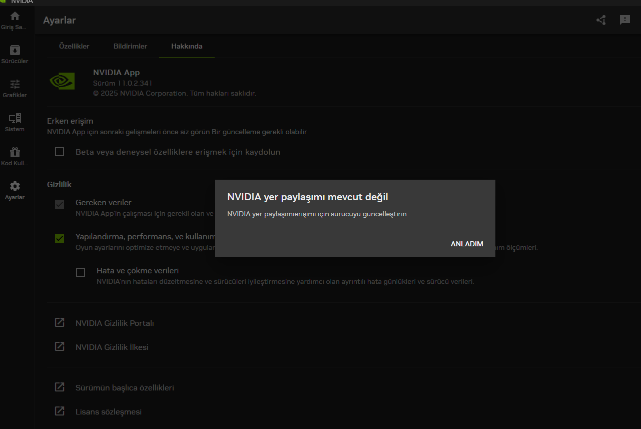 Az önce DDU ile ekran kartı sürücümü kaldırıp tekrar yükledim. Her şey tamam sıkıntı yok fakat NVIDIA App'de yer paylaşımı kapatılmıyor. Sürücüyü güncelleyin diyor. 2-3 kez silip yükledim fakat olmadı. Ne yapmam gerekiyor?