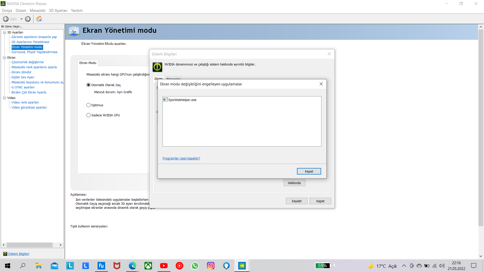 Öncelikle herkese sağlıklı huzurlu geceler. Lenovo Legion 5 Pro bilgisayarımda NVIDIA contaıner ekran modu değiştirilemiyor hatası sebebiyle oyunlarda kendi 2K monitör çözünürlüğü hariç tam ekran yapmıyor. Öncesinde NVIDIA contaıner, harici ile dahili ekran kartları arasında geçiş yaptığı süre zarfında bu problem olmuyordu. Bilgisayarımı kapatıp bir süre dışarı çıkıp gelmem akabinde oynayacağım oyuna giriş sağlayınca böyle hata ile karşılaşmaya başladım. Bunun öncesinde Experience uygulamasına giriş yapmama rağmen süreki uygulamayı kapatmam akabinde yeni oturum açma isteğiyle boğuşmam sebebiyle bu uygulamayı kaldırıp DDU ile NVIDIA sürücülerini kaldırıp Experience olmadan grafik sürücüleri özel kurulum temiz kurulum yap seçeneğiyle kurduğumda problem ortadan kalkmıştı. Tekrar laptopu açtığımda bu hata ile karşılaşmaya başladım ekte örneği bırakacağım bu konuda engin tecrübe ve bilgileriniz, sizlerden yardımlarınızı rica ediyorum şimdiden teşekkürler.