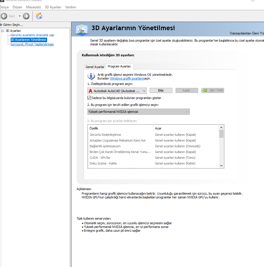 AutoCAD programımda prizde çalıştırınca kasma prizden çıkartıp bataryada kullanınca daha iyi olduğunu gördüm, NVIDIA denetim masasında FPS veya pil ile ilgili düzenlemeler yapabileceğimi düşündüm ama program düzenlememe izin vermiyor. Bunu nasıl açabilirim?