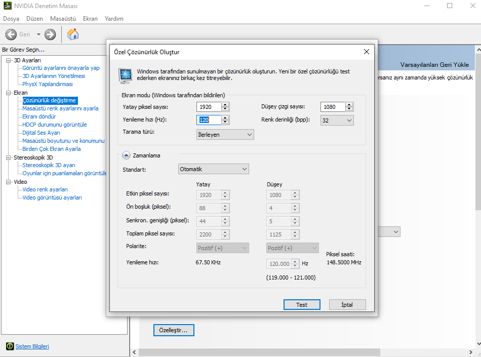 Merhabalar, monitörüm 144Hz ancak NVIDIA ayarlarda 60Hz üstü göstermiyor. Resimdeki gibi özel çözünürlük yaparsam bir sıkıntı olur mu 120Hz olarak?