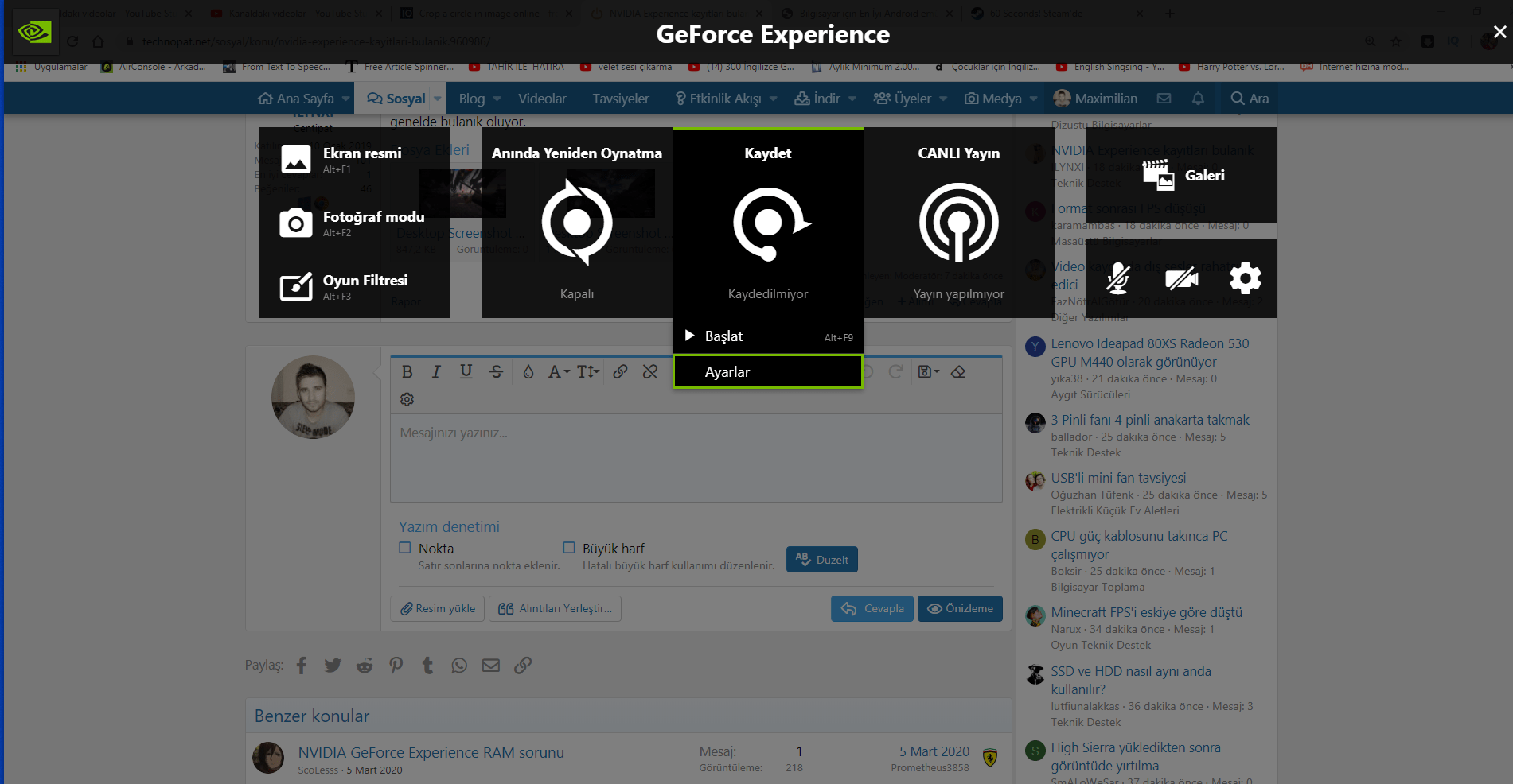 Merhaba arkadaşlar. Uzun zamandır GeForce Experience kullanıcısıyım. Eskiden aynı kayıt ayarlarıyla aynı oyundaki kayıtlarım gayet güzeldi. Fakat son zamanlarda ki kayıtlarım resmen bulanık sanki 360P gibi. Oysa 1080P kayıt al olarak ayarladım. İkisi arasındaki farkı görmeniz için videoların bazılarını durdurup ekran görüntüsü alacağım ve aşağıya ekleyeceğim. Çok nadiren eskisi gibi kaliteli kayıt yapıyor ama genelde bulanık oluyor.