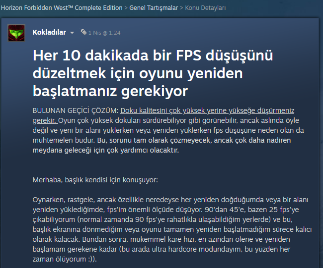 Kral bir çözüm bulabildin mi ? RTX 4060 ti kullanıyorum, ben de aynı sorunları yaşıyorum. Oyunu durdurduğumda veya öldüğümde tekrardan başlayınca fps düşüyor, bazen düzeliyor bazen 10 fps lere düşüyor. Stabil çalışmıyor dlss frame generation. Oyunu sürekli baştan açmam gerekiyor ve bu çok can sıkıcı olmaya başladı.