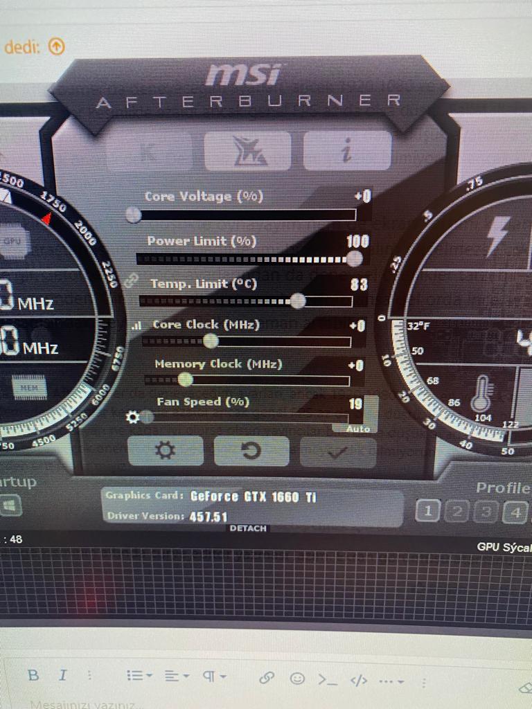 Hocam bu MSI Afterburner ile alakalı dediklerinizi tam anlayamadım. İsterseniz sizin arayüz ile aynı yapayım sizin arayüz üzerinden anlatın. Bendeki bu grafikte ayar da yapamıyorum çünkü.