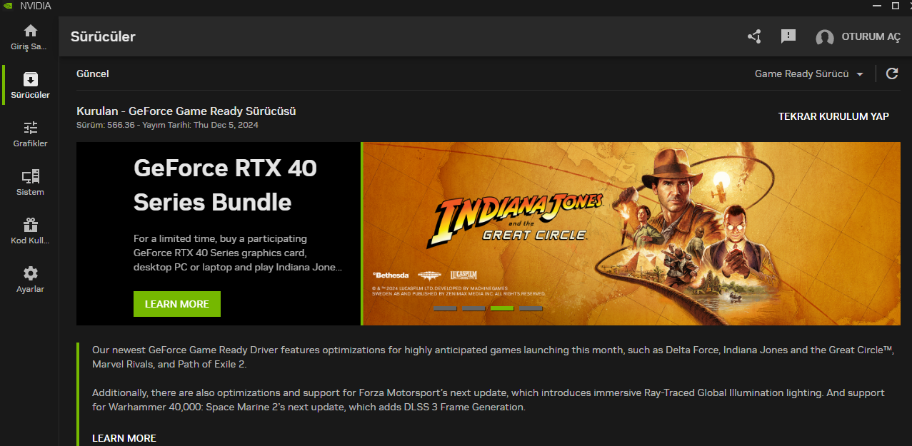 NVIDIA yeniden kurulum yap hatası