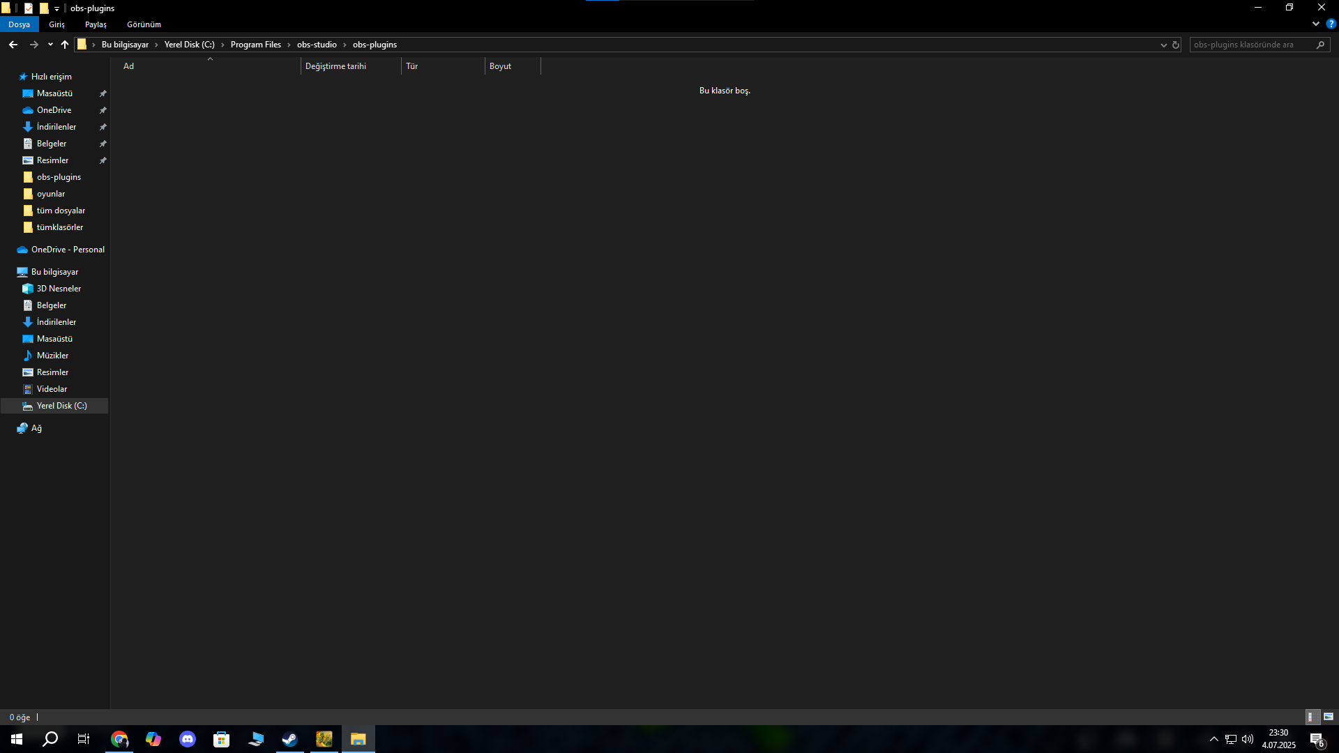 Bu hata, OBS'in dosya konumuna girince OBS Plugins'de hiçbir şey yok diye gözüküyor. Ondan kaynaklanabilir mi?