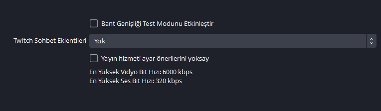 Yayın hizmeti ayar önerisini yoksay seçeneğini tıklarsan 8k bit verebilirsin. Twitch stabil olarak 320 ile 6000 kbps öneriyor. Tıklayarak bunu yok sayıp 6k üstüne çıkabilirsin. 8k üstü çıkmak yayını kararsızlaştırır.