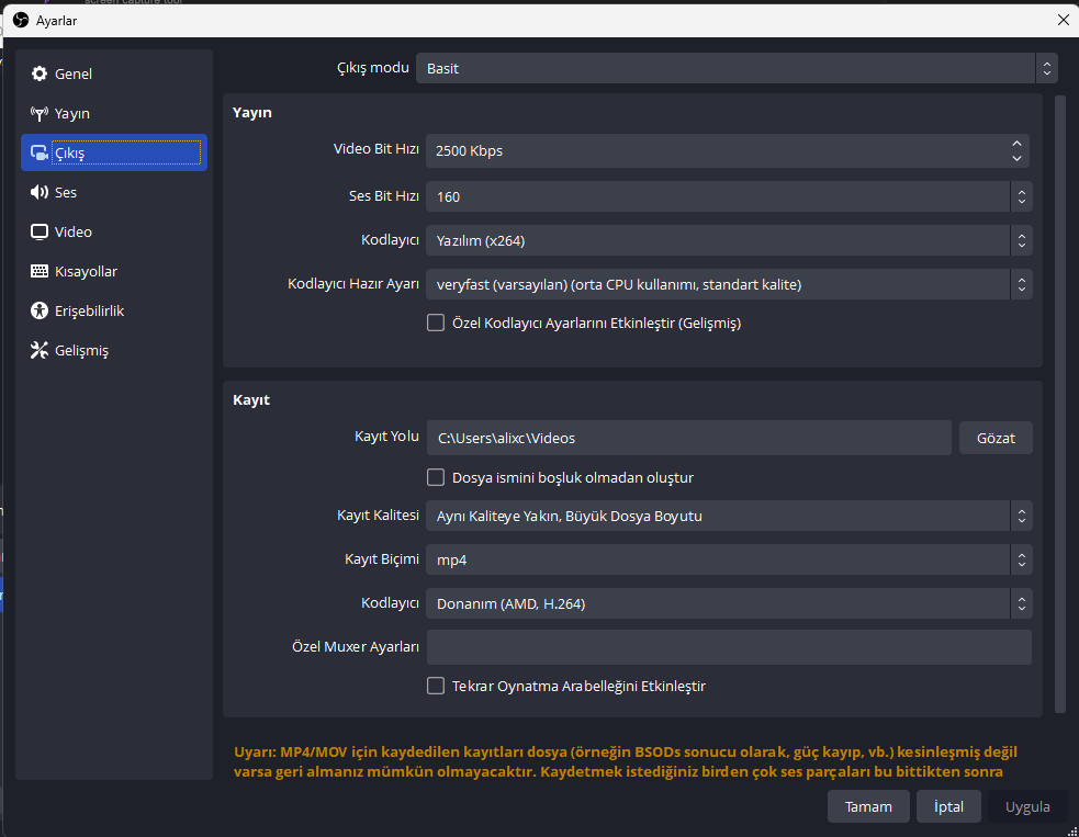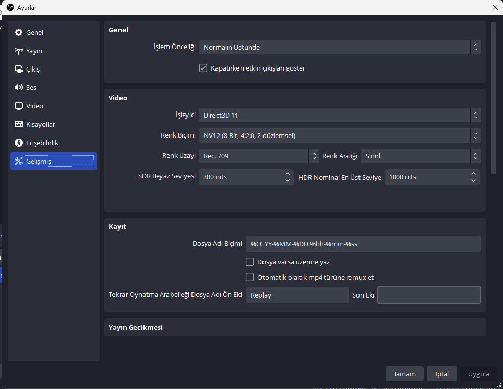 İlgilinizi çekecek ayarlar şu şekilde. Zaten ses filtrelerim dışında yapılan ayarların tamamı burası. İşlem önceliğini en yükseğe de çektim ama faydası yok. AMD driveri üzerinden de video çekebilirim ama ses filtreleri tatmin etmiyor. OBS'nin ses filtre ayarları, sesimi çok daha iyi hale getiriyor. OBS'nin üzerine bu kadar düşmemin tek sebebi bu.