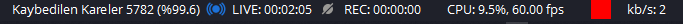 OBS'deki değerlerim. 2 kb/s olan kısım nadiren 300-500 oluyor. Yayına da 10-20 saniyede ancak 1 kare gelebiliyor.