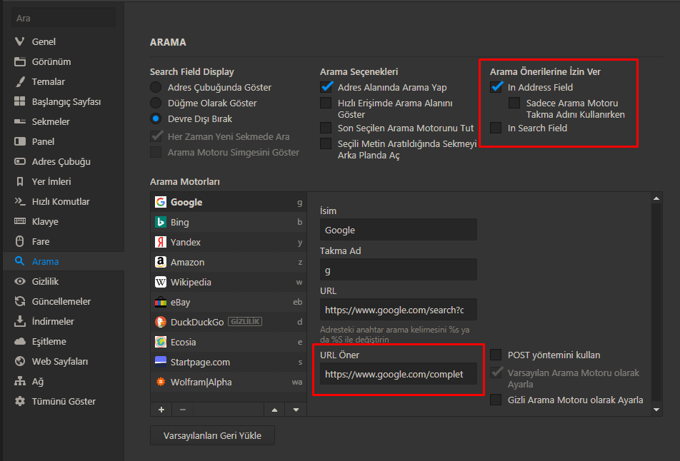 2- Ayarlar > Adres Çubuğu > Adres Alanı Açılır Menüsü kısmında tik yok ise işaretleyin ardından Arama kısmına gelin ve “URL Öner” bölümüne şu bağlantıyı kopyalayıp yapıştırın: