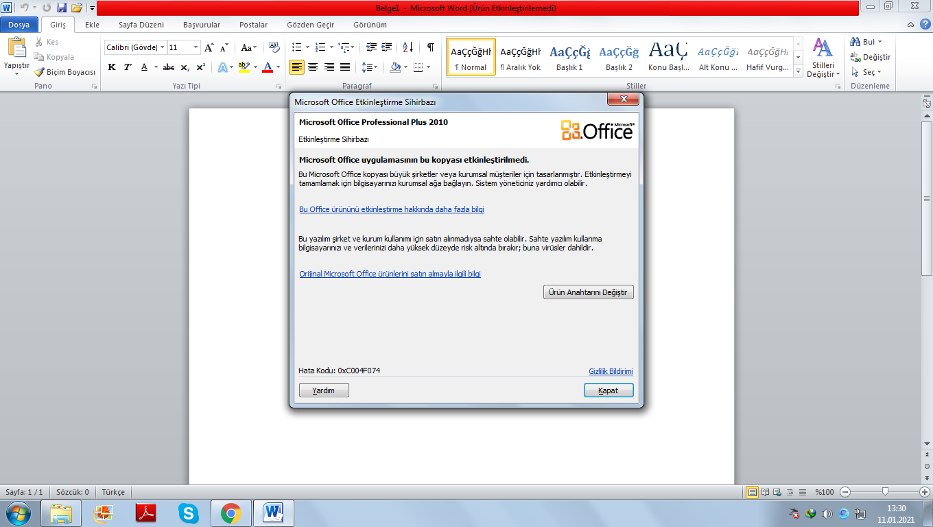 Merhaba. Bu bilgisayar ben küçükken alınmış. Ben hatırlamıyorum. Office bilgisayar ile birlikte gelmiş galiba çünkü kasamın yanında ürün anahtarı var. Ve şu an da Office etkinleştirme istiyor. Bunu korsan olmadan veya virüs girmeden nasıl halledebilirim? Ürün anahtarı değiştire mi basayım ne yapayım. Ne olur söyleyin. Yoksa virüs girecek. Şöyle bir ekran çıkıyor.