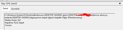 C:\Windows\System32\RuntimeBroker.exe (DESKTOP-GINGDIS) işlemi DESKTOP-GINGDIS kullanıcısı adına şu nedenle DESKTOP-GIGJNIS bilgisayarının kapat öğesini başlattı: Diğer (Planlanmamış)
