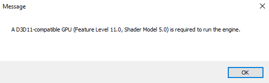 A D3D11-compatible GPU (feature level 11.0, shader model 5.0) is required to run the Engine.