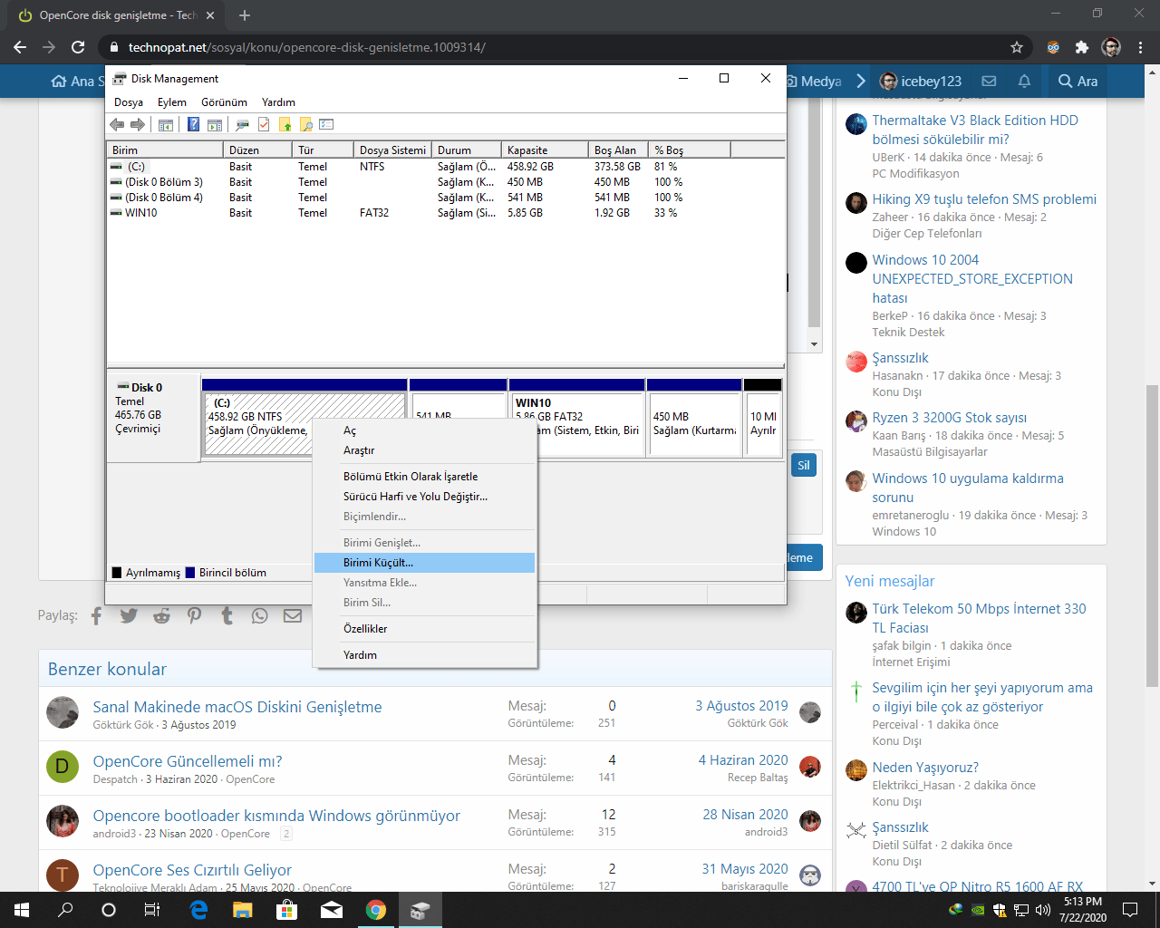 Windows yanına Dual bot olarak OpenCore kurdum. 60 GB disk vermiştim ilk başta fakat şu an yetmiyor. Windows diskini ayırıp 100 daha macOS tarafına eklemek istiyorum. Bölüntüleme vs gibi şeyleri denedim fakat sonuç alamadım.