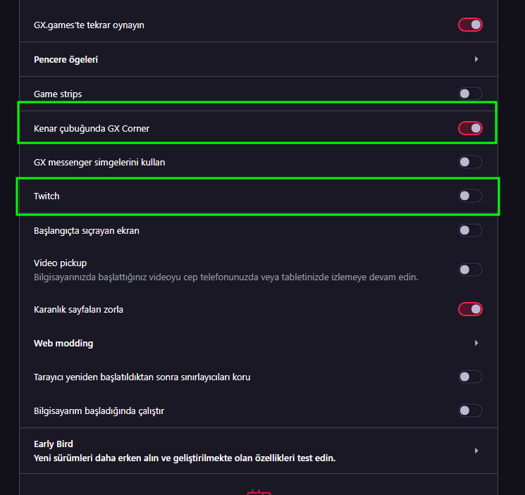 Ayrıca gx için şu ayarları yapın. Gx corner kenar çubuğunda siz açmadığınız sürece arka planda kaynak tüketmez. Kenar çubuğunda Twitch'de benzer şekilde siz kullanmasanız bile kaynak tüketiyor. O yüzden kapatın. Ayrıca Gx'in sunduğu görsel efekt ayarlarını da kapatın. Mods falan kullanılmasını pek önermiyorum.