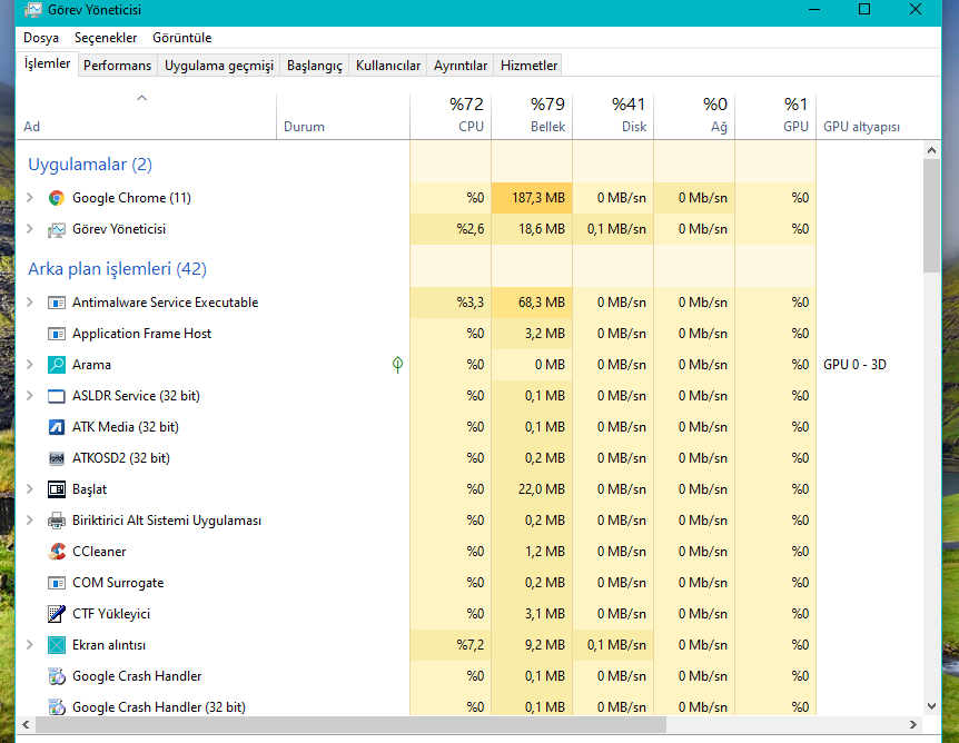 Bu resim de böyle gözükebilir ama ben CPU'yu %10'a Bellek'i %39 %45'e düşürdüm Disk'i de %1'e kadar düşürdüm.