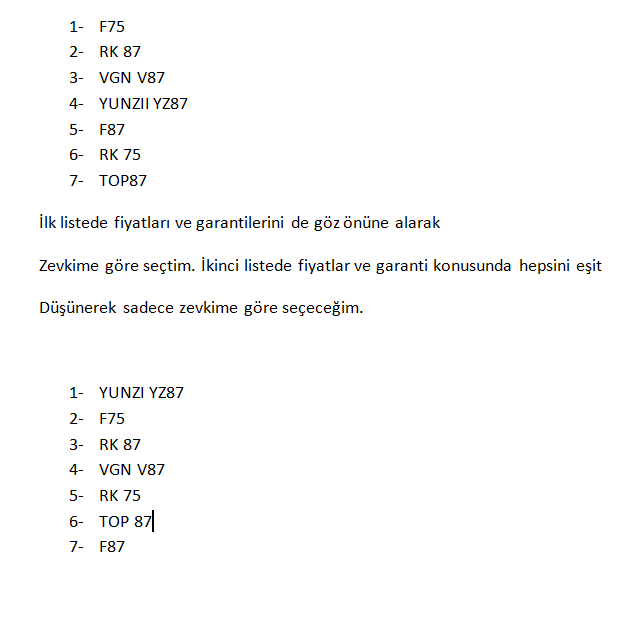 Alu87a nın sebebi. Diğer klavyelerin aksine metal kasaya sahip olması, switchleri gördüğüm en sessiz stok switchler ve son olarak mekanik klavye olmasına rağmen snap tap özelliği olması ilgimi çekti.