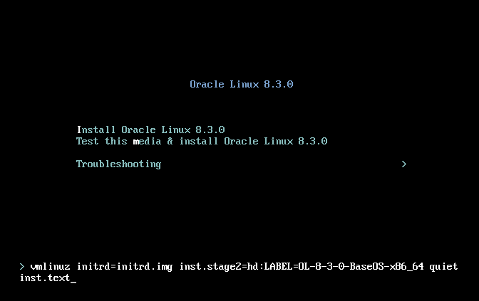 Burada "install Oracle Linux" seçeneğinin üzerine gelip "Tab" tuşu veya "e" tuşuna basarak bu önyükleme seçeneğini düzeltiyoruz. Karşımıza şu iki ekrandan biri çıkacaktır: