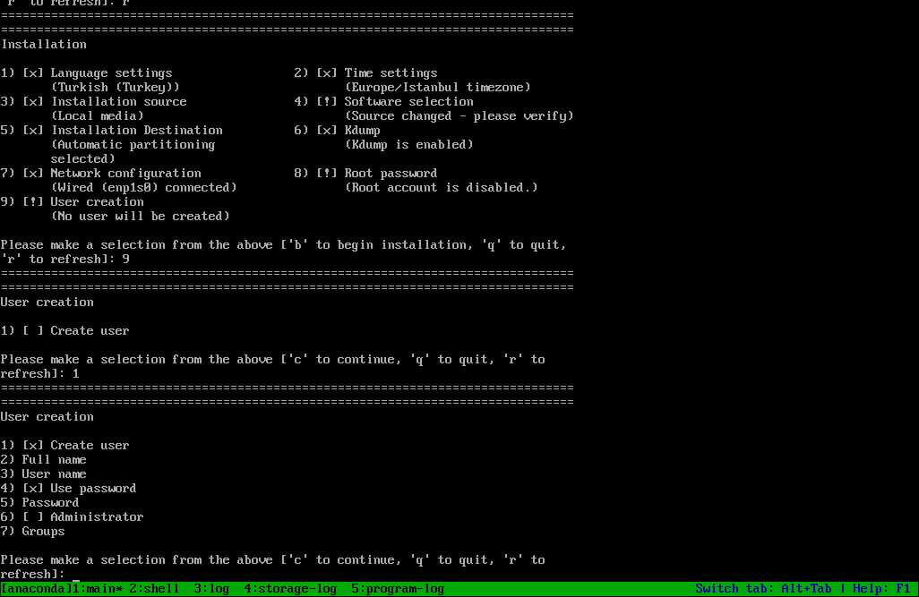 Buradan sonunda "quiet" yazan önyükleme seçeneğinin yanına "inst.text" yazısını ekliyoruz ve "CTRL+X" tuşu veya "enter" tuşuna basarak sistemi başlatıyoruz ve karşımıza şöyle bir ekran geliyor: