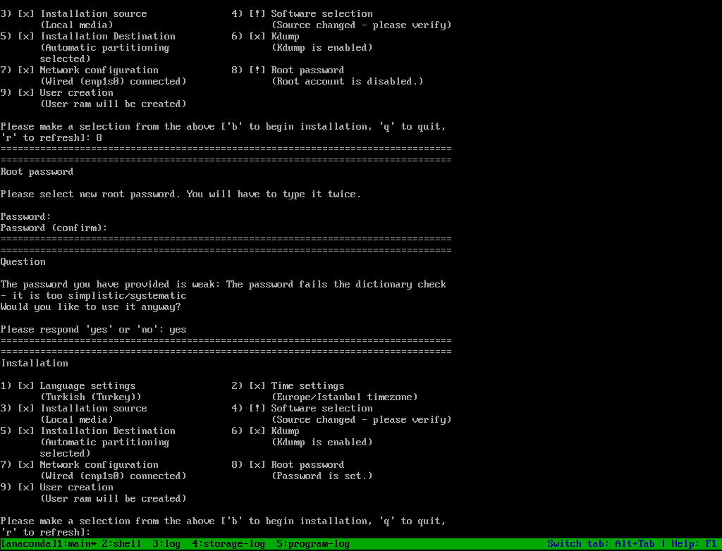 Şifremizi oluşturduktan sonra gerekli tüm adımları bitiriyoruz ve kuruluma başlıyoruz.