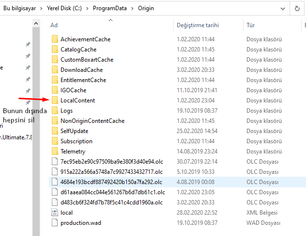 - Origin klasöründeki LocalContent hariç tüm dosya ve klasörleri silin (bu dosyayı silmeyin)
