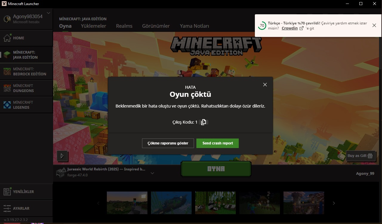 Ve Mınecraft launchera her güncellemede hata veriyor