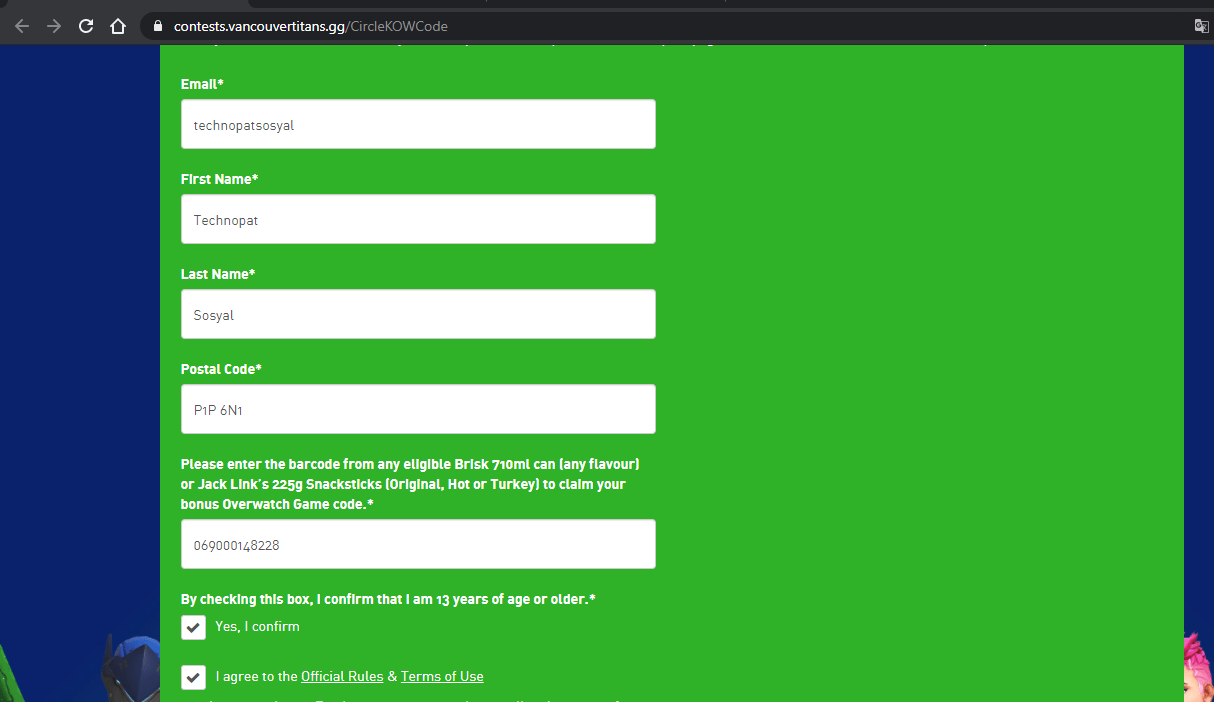 Adım 2: Bilgileri doldurun, Postal code kısmına P1P 6N1, Barcode kısmına 069000148228 yazın.