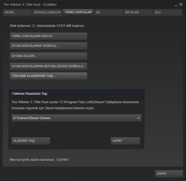 Steam'in oyun dosyalarını taşıma özelliği bulunmakta. Kütüphane > Oyun > Özellikler > Yerel Dosyalar > Yükleme Klasörünü Taşı: