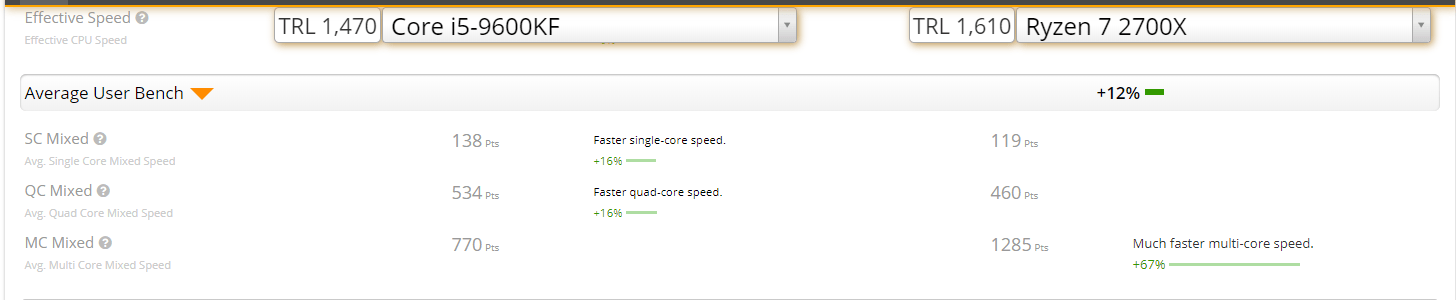 Tek ve dört çekirdek skorunda 9600K, 2700X'den %16 yüksek. Hız aşırtmalı skorlarında ise bu fark %26' ya kadar çıkmış.