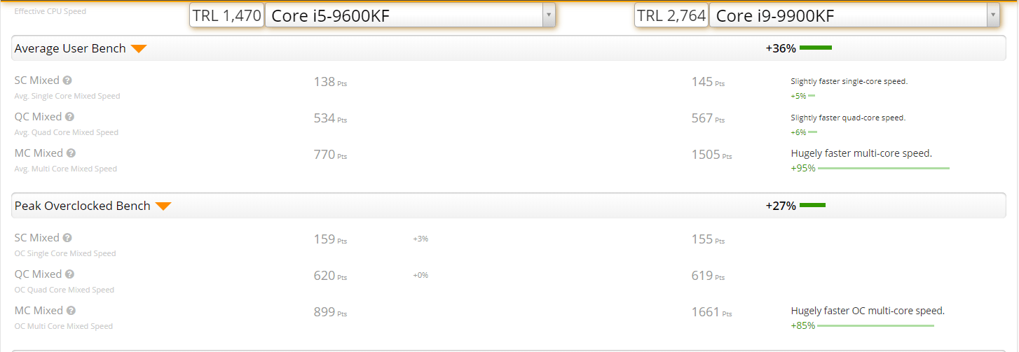 9600K ile 9900K'nın arasındaki fark en fazla %6. Darboğaz olmadığı sürece intel işlemcilerinin daha performanslı olma sebebi budur diye düşünüyorum.