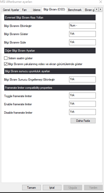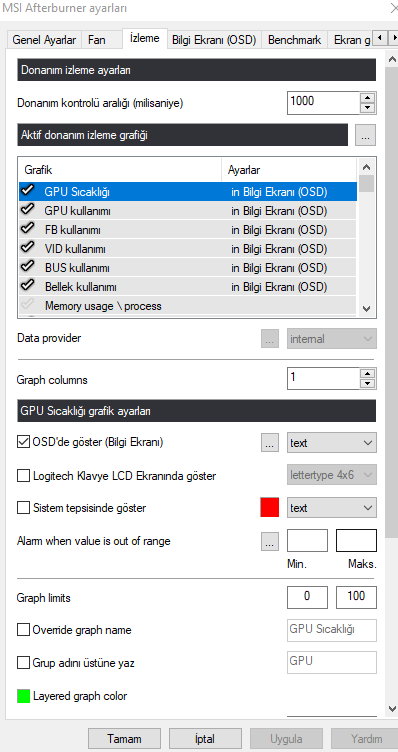 MSI afterburner programında Ayarlar izleme kısmında