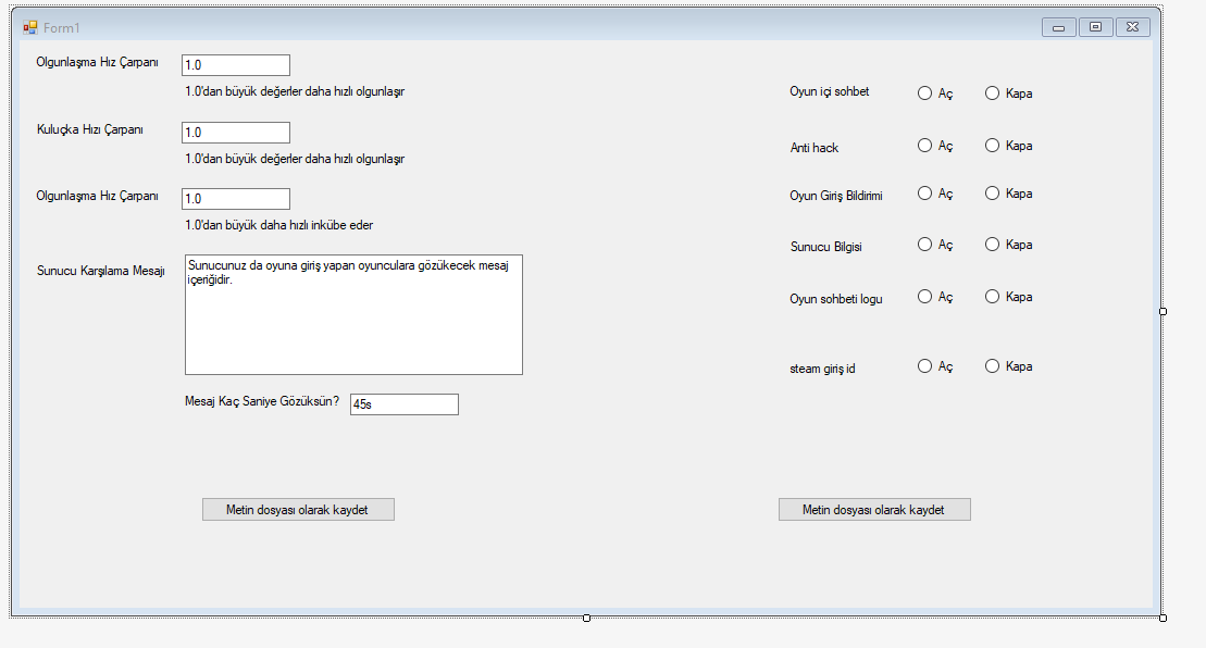 Düşüncem oyunu yön veren çarpanlar, rakamlar, sunucu adı vb. kısımlarını form içinde bir metin dosyası gibi gömüp forma ekleyeceğim textbox ve radyo botunlar ile yönetmek. Aşağıya ekleceğim 2 resim referanstır. Şimdiden herkese teşekkürler.