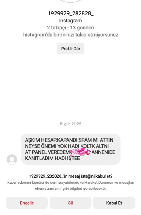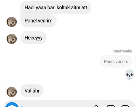 Instagram'da birisi nude istedi ben de para atarsa olabileceğini söyledim, para atmayacağım dedi ben de paran yoksa bb yazdım. Şimdi ailemin numarasını panelden SS atarak beni tehdit ediyor. :D