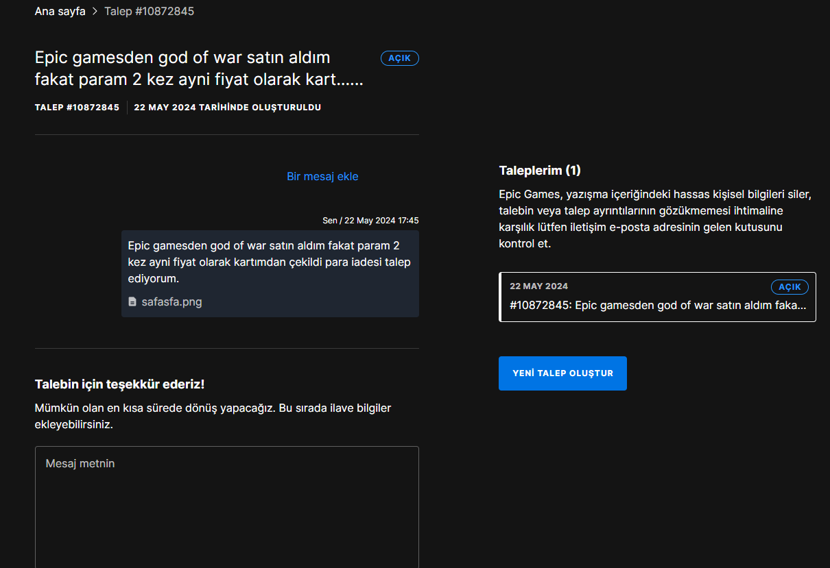 Merhaba. Bugün Epic gamesden 417,34 TL'ye God of War satın aldım fakat kartımdan oyunun parası 2 kez çekildi. Hemen destek talebi oluşturdum fakat aklımda soru işaretleri var ben bu parayı iade alabilir miyim?