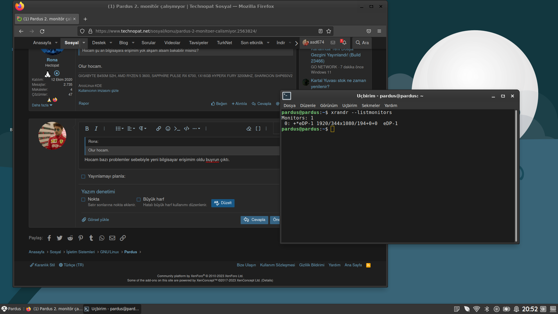 Tamamen denemek amaçlı SSD'min boş bölümüne Pardus kurdum. Ancak ikinci monitörüm sadece şifre girme ekranında geliyor sonra geri gidiyor.