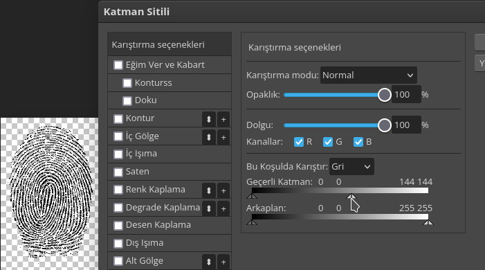Her parmak izinin bu şekilde şemasını aldıktan sonra HUE değerini değiştirip farklı renklere alıp iki parmak izini üst üste koyarak renk çıkıntılarından anlarsın. Veya elle karşılaştırırsın. Sana kalmış.