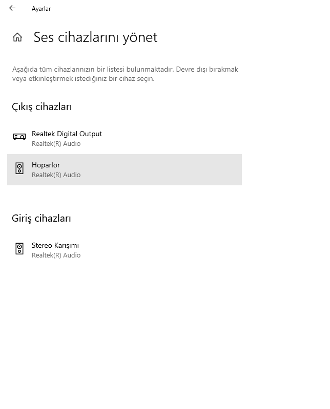 Yine aygıt yöneticisinde yukarıda donanım değişikliklerini tara seçeneği var, ona bir basın belki ondan sonra mikrofon ortaya çıkar.mikrofon ordada gözükmuyor . sadece hoparlör , realtek digiital output ve stereo karışımı var . hepside etkin.
