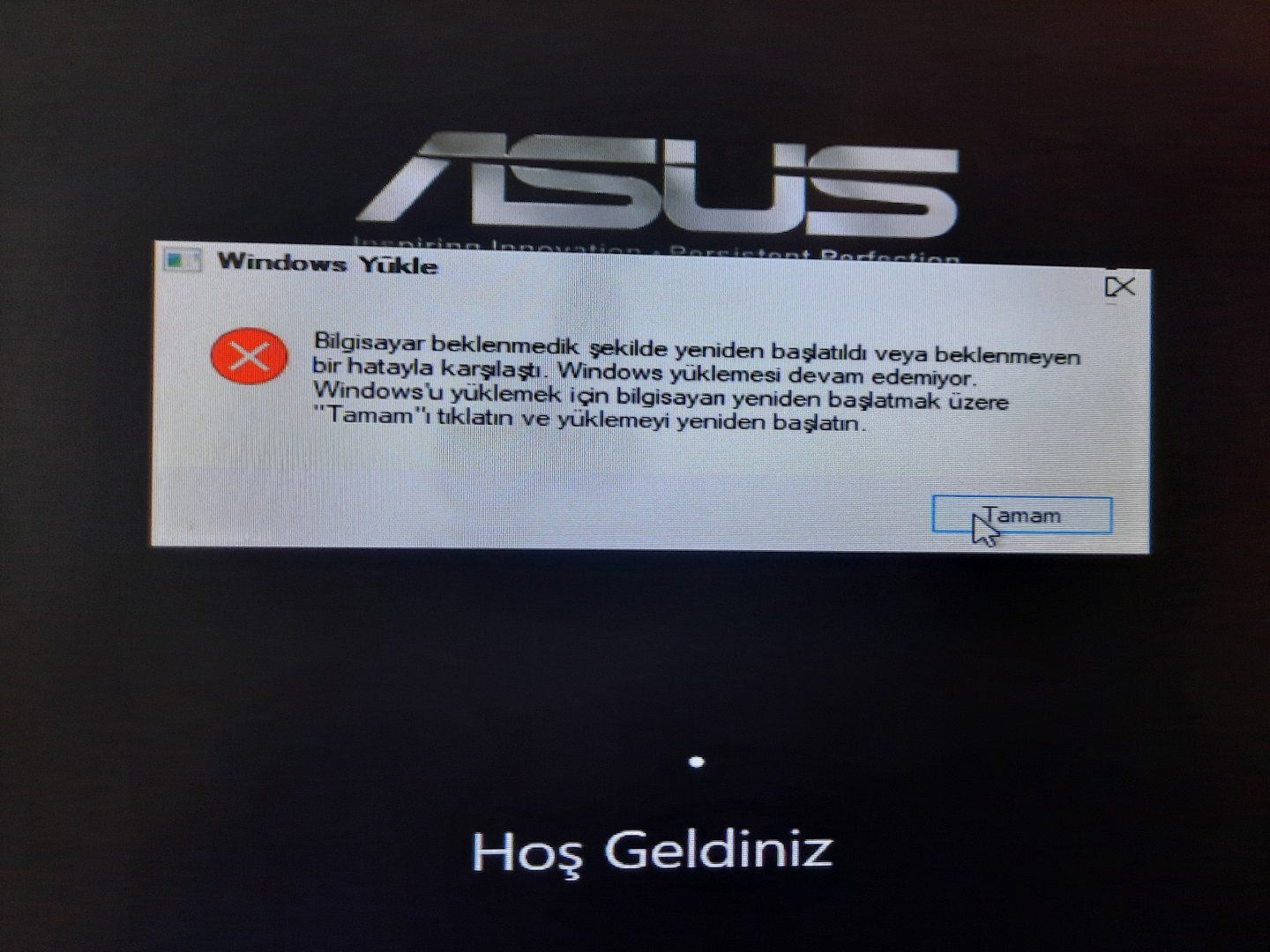 Bilgisiyari açtigimda BIOS ekranı geliyor ama Windows'a girerken siyah ekran da kalıyor. O olmadan önce bilgisayar sorunsuz çalışıyordu ama ne olduysa birden ekran renklenmeye başladı kare kare renkler geldi gitti ilk başta sorun etmedim fakat birden tamamen ekran gitti. Bilgisiyari kapattim biraz olur diye denedim her seferinde Windows siyah ekranda kaldi bende gelişmiş seçeneklerden format attım bu sefer de şu ekran geliyor tamam a bastığımda bilgisayar gidiyor geliyor siyah ekranda kalıyor.