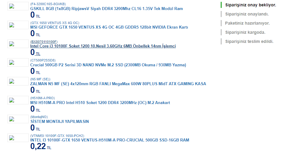 Vatan geçen bir sistemde ekran kartını takılı bir şekilde gönderim yapmıştı.Alacak arkadaşlar dikkat etsin, montajsız teslim seçili.