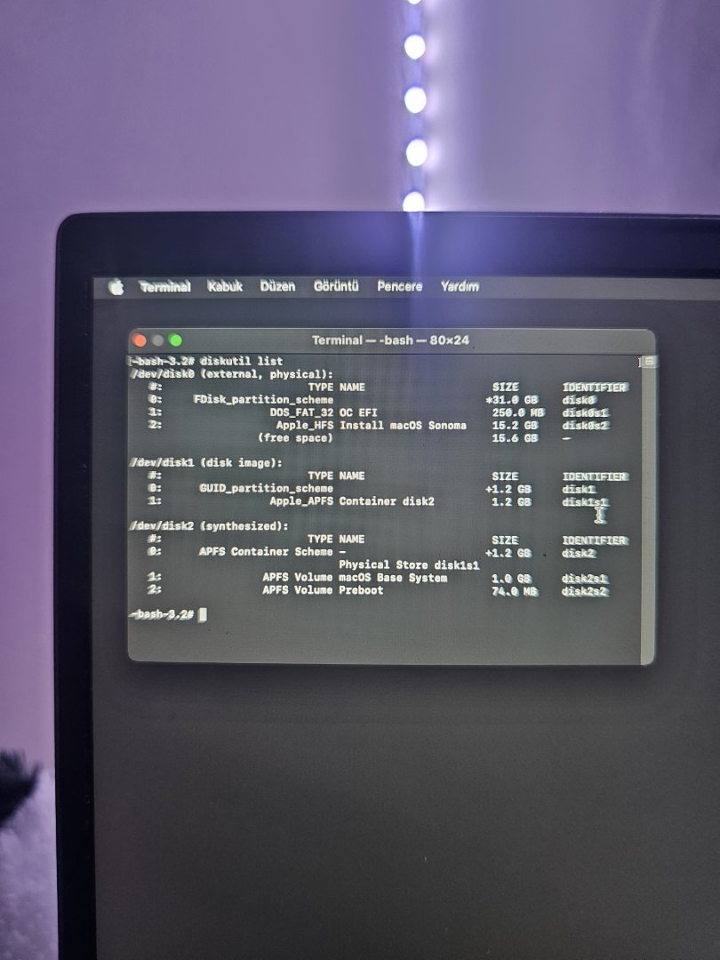 Araştırmaya devam... Terminale eriştim. "diskutil list" yaptım ve diskimi aradım. Bulamadım. Bulsam bitecek biliyorum. Hiç kolay olmadı ki bu zamana kadar hevesle yaptığım şeyler.