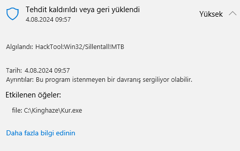 Kaspersky KVRT ile tekrar denemek istedim, Windows Defender bunu gönderdi fakat taramada sorun yaşamadım bu nedir acaba @731001. ilk denememde çıkmamıştı böyle bir şey