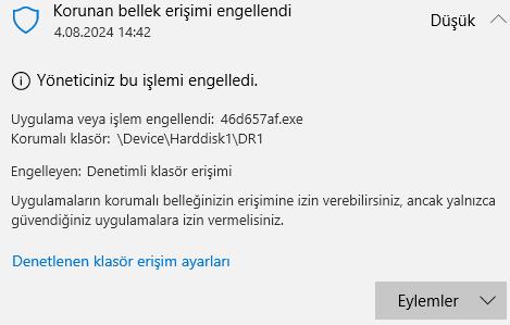 Bu Defender'in Ransomware bulaşmalarını engellemek için olan bir özelliği, ama ne hikmetse kendisi virüs değil herşeyi engelliyor. Zula açtırmıyordu bir ara. Defender'i kapatıp öyle açabilirsiniz KVRT'yi. Büyük ihtimalle sorun yok AVG,E.E.K,ESET ve KVRT İle Tam Tarama yaptıysanız.