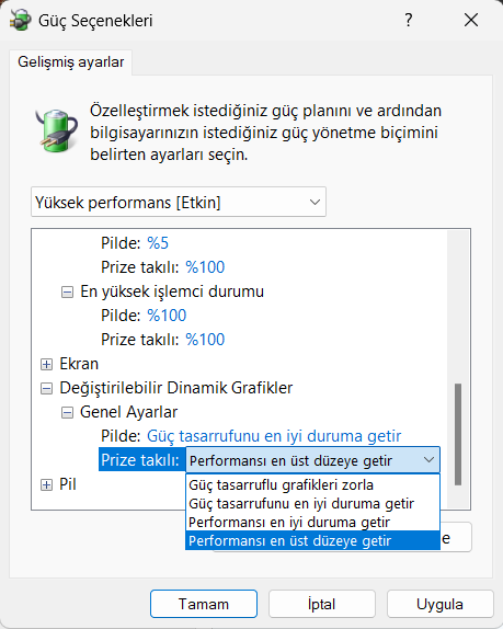 En aşağıdaki seçenek daha fazla performans sağlayacak doğru anladım değil mi? Biraz bilgisayar ayarlarına bakıyorum da, ne varsa performans moduna almak için.
