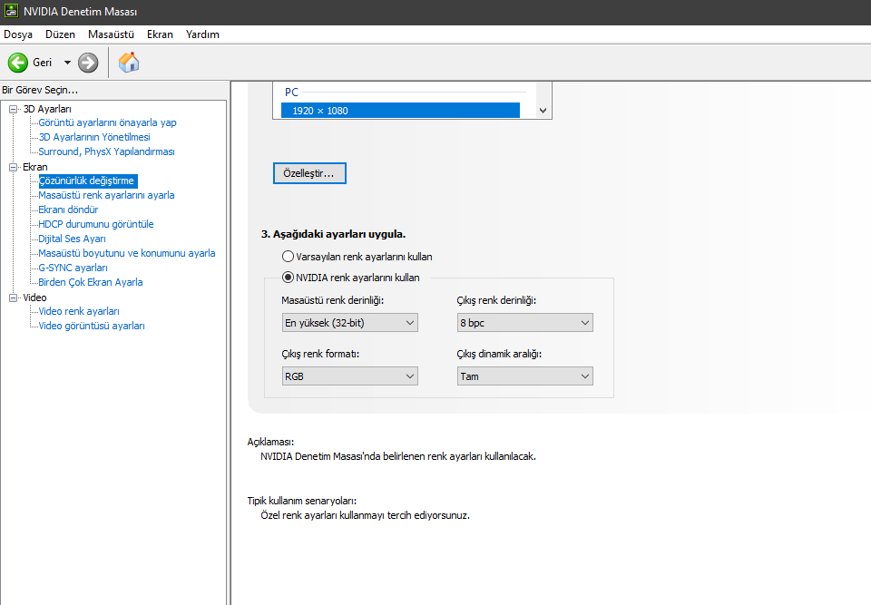 Buna benzer bir sorun daha önce bende de olmuştu. NVIDIA Denetim Masası'ndan, çözünürlük değiştirme / NVIDIA renk ayarlarını kullan seçeneğini açınca düzelmişti. Umarım bu ayar size yardımcı olur.