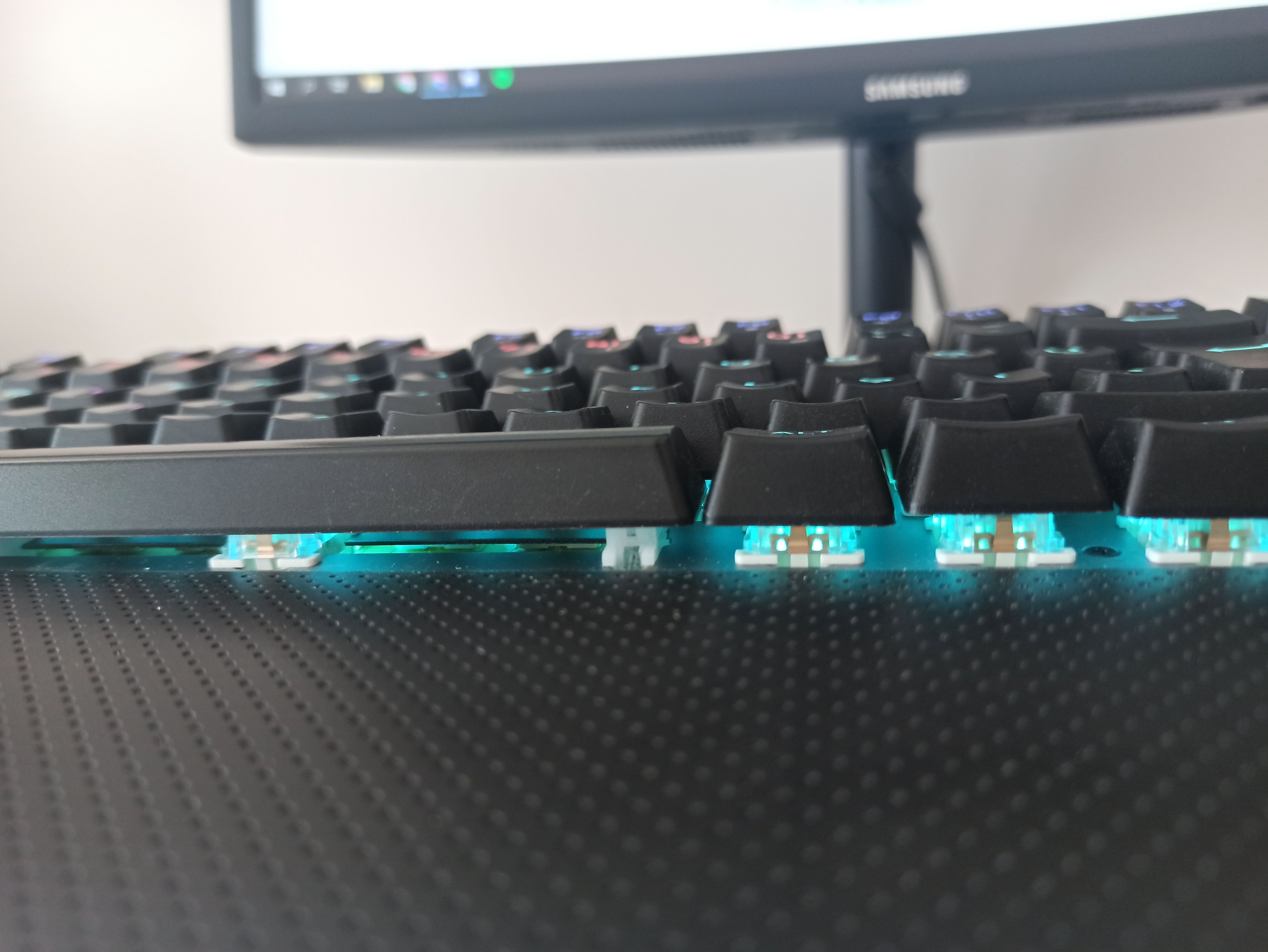 Klavyenin kasası sağlam ve genel olarak Premium hissi veren bir tasarımı var. Tuşlar reo marka Blue Switch'e sahip, ses ve hissiyatı gayet iyi. Klavyede anti ghosting özelliği mevcut ve Windows tuşunu kilitleyebiliyorsunuz. Sağ üstteki multimedya tuşları da gayet kullanışlı. Ses tekerleği hem sesi hızlıca ayarlamanızı ve basılı tuttuğunuzda oyun moduna geçip hem de aydınlatmayı ayarlamanızı sağlıyor. M1, M2 ve M3 tuşları ise normal modda şarkıyı durdurma, geçme, önceki şarkıya dönme gibi şeyler için kullanılırken, oyun modunda 3 farklı mod ayarlamanıza olanak sağlıyor. Mesela CS:GO için kullanacağınız tuşları seçip M1'e basıyorsunuz ve oyun modunda M1'e bastığınıza sadece o tuşların ışıkları yanıyor.