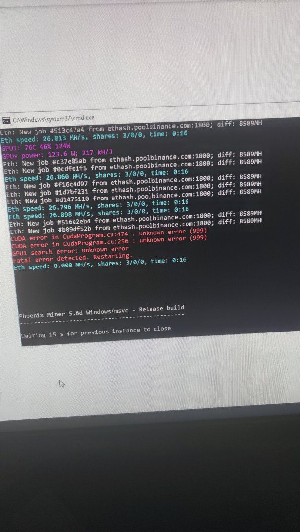 4 5 gündür mining yapıyorum Phoenix mining üzerinden Binance pool a. Geçen günlerde forumda OC konularını okudum ve OC yaptım. 30 saat sonra falan ortalama böyle bir hata aldım. Hata kodları bunlar ve ekran gidip geliyor 3 4 saniyeliğine.