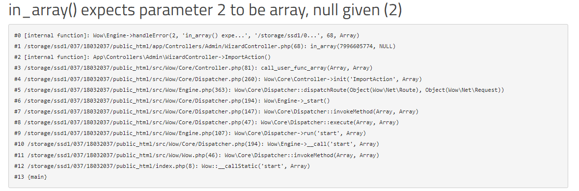 in_array() içinde 2. parametrenin array olmasını istiyor. Şu an array olmadığı için null döndürüyor büyük ihtimal.